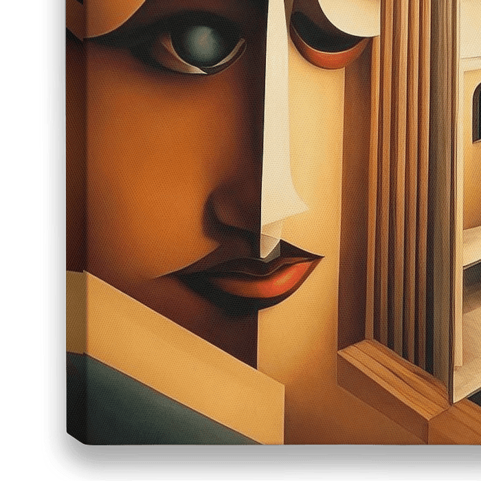Une histoire se déroule dans cette maison aux formes géométriques et aux couleurs sourdes. Les portraits subtilement incorporés dans le paysage architectural semblent à la fois cachés et proéminents. Au centre se trouve une dame, dont la présence est comme un point d'ancrage dans cette mer d'abstraction. En haut à droite, nous trouvons un couple dansant dans les escaliers, leur mouvement semble aussi intemporel que l'espace dans lequel ils se trouvent.