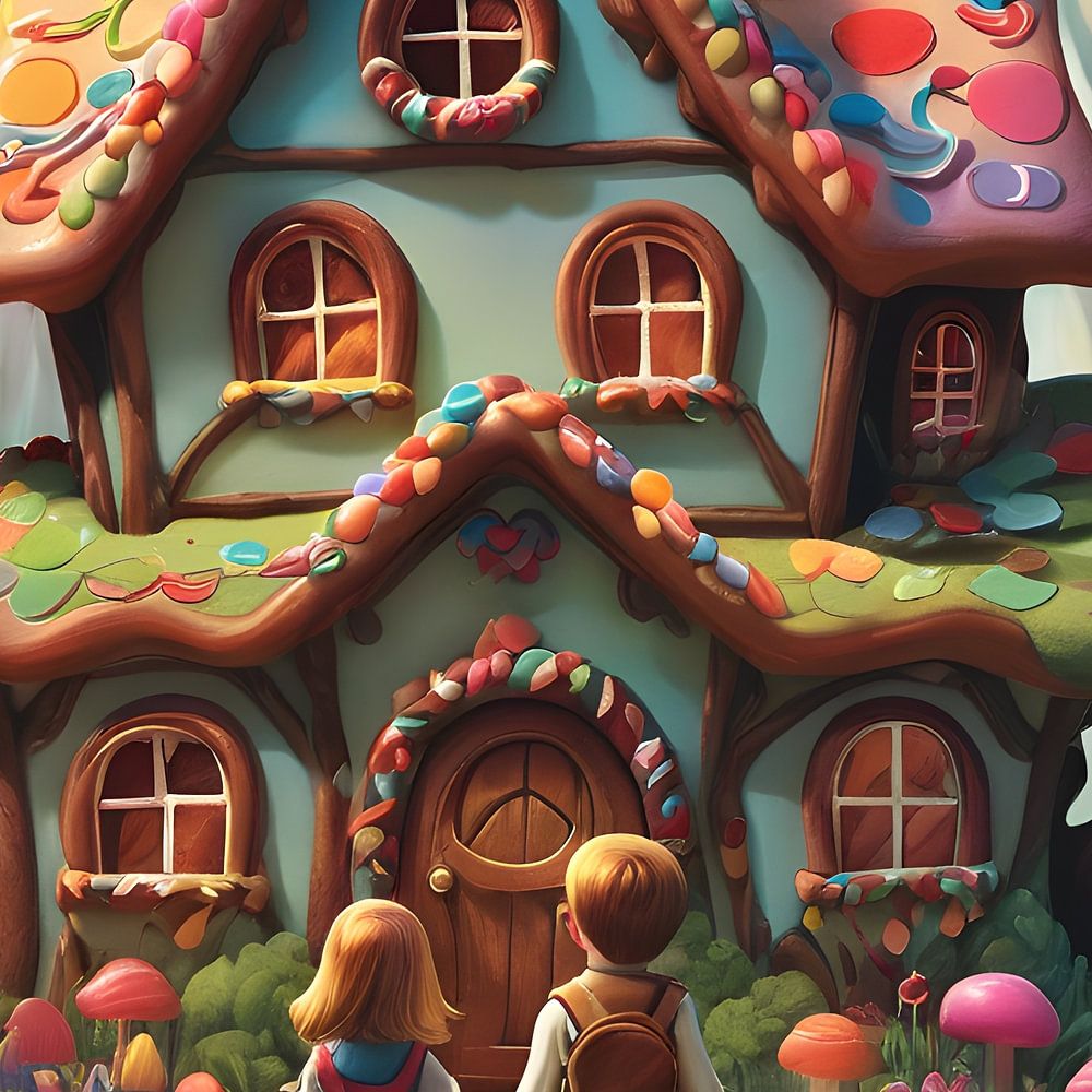 Cette œuvre d'art représente une scène enchanteresse d'une maison de fées au milieu d'une forêt mystérieuse. La maison, dont le toit est recouvert de bonbons colorés et dont la porte est accueillante, évoque immédiatement le conte de fées classique de Hansel et Gretel. Devant la maison, deux enfants se tiennent main dans la main, faisant leurs premiers pas dans un monde magique plein d'aventures.