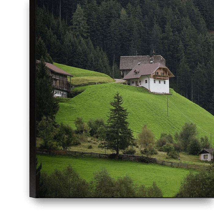 Maison sur une colline dans les Dolomites italiennes. Derrière elle, une montagne couverte de conifères.