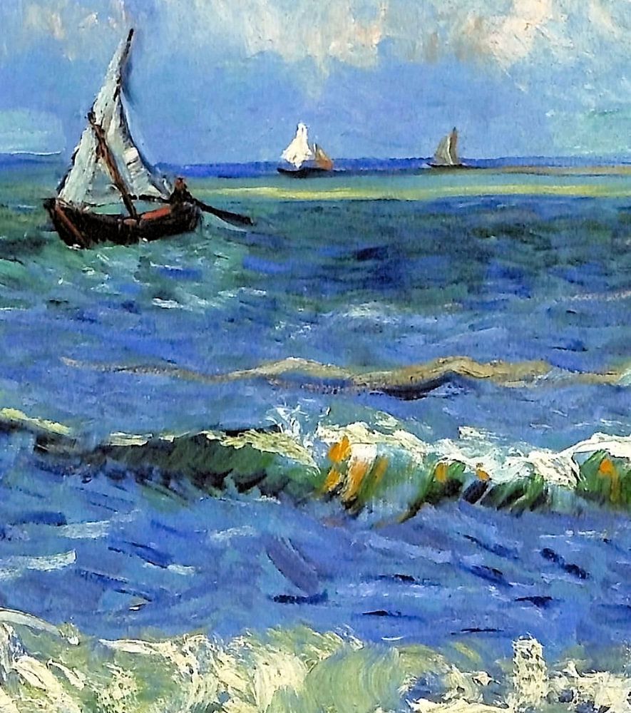Un collage inspiré d'une peinture de Vincent van Gogh. Les vagues du bas sont réalisées en Mono print. En haut et sur les côtés, des bandes découpées ont été collées. Le collage donne une belle image d'une journée d'été dans le sud de la France. C'est d'ailleurs dans cette région que Vincent a peint ce tableau lors de son séjour.