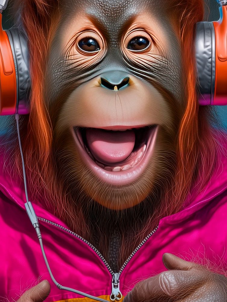 orangoutan, casque, musique, singe, portrait, humour, animal, numérique, couleurs, sourire, moderne, jungle, art, anthropomorphisme, orange, magenta, jaune, joie, technologie, nature, réaliste, visage, yeux, fourrure, vêtements, capuche, veste, expression, nature sauvage, primate