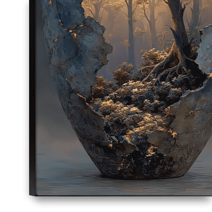 Cette peinture raconte une histoire de fragilité et de force. Derrière la surface altérée et craquelée d'une jarre en pierre se cache un monde caché : un arbre majestueux baigné par la lumière chaude du soleil, ancrant fermement ses racines, symbole de vie, de croissance et de résilience.