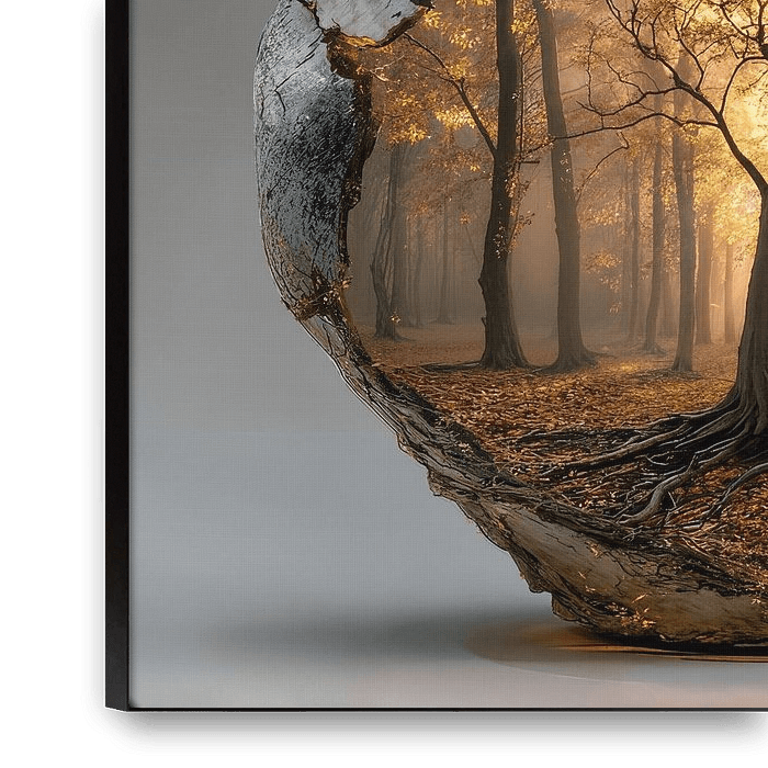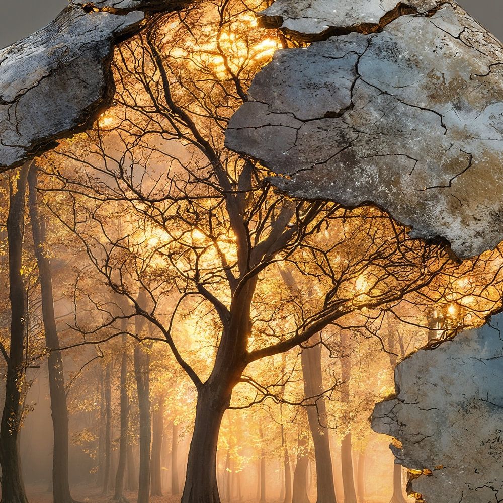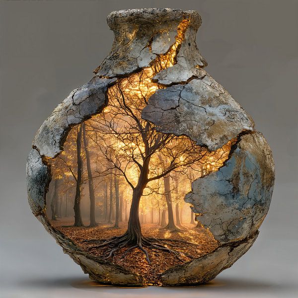 Cette peinture raconte une histoire de fragilité et de force. Derrière la surface altérée et craquelée d'une jarre en pierre se cache un monde caché : un arbre majestueux baigné par la lumière chaude du soleil, ancrant fermement ses racines, symbolisant la vie, la croissance et la résilience.