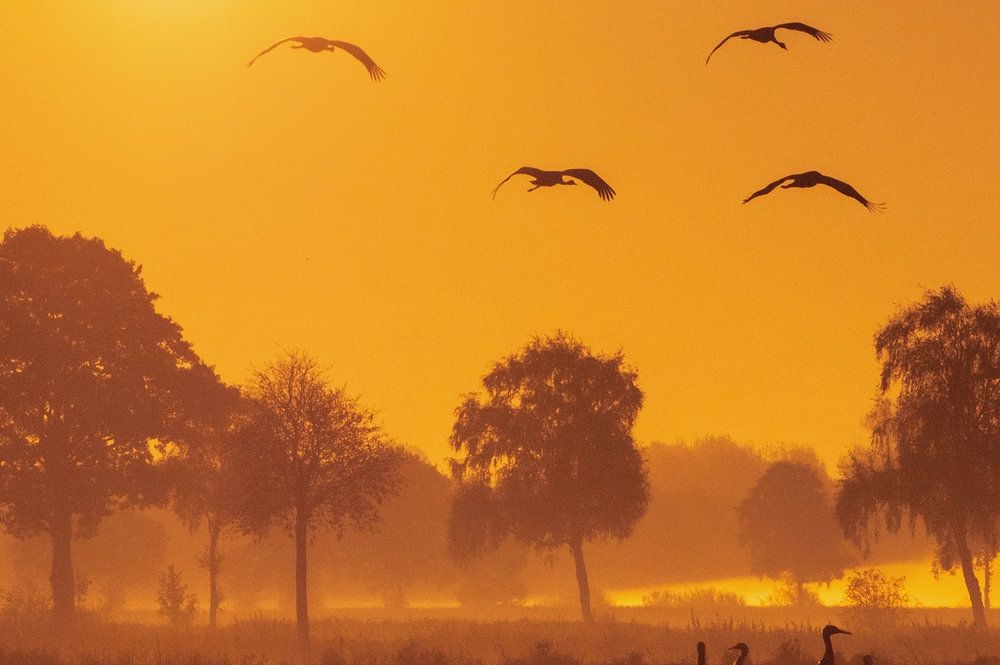 Les grues, vieux et jeunes oiseaux, se rassemblent sur les champs de maïs récoltés pour se fortifier une fois de plus avant le grand voyage vers le sud.
