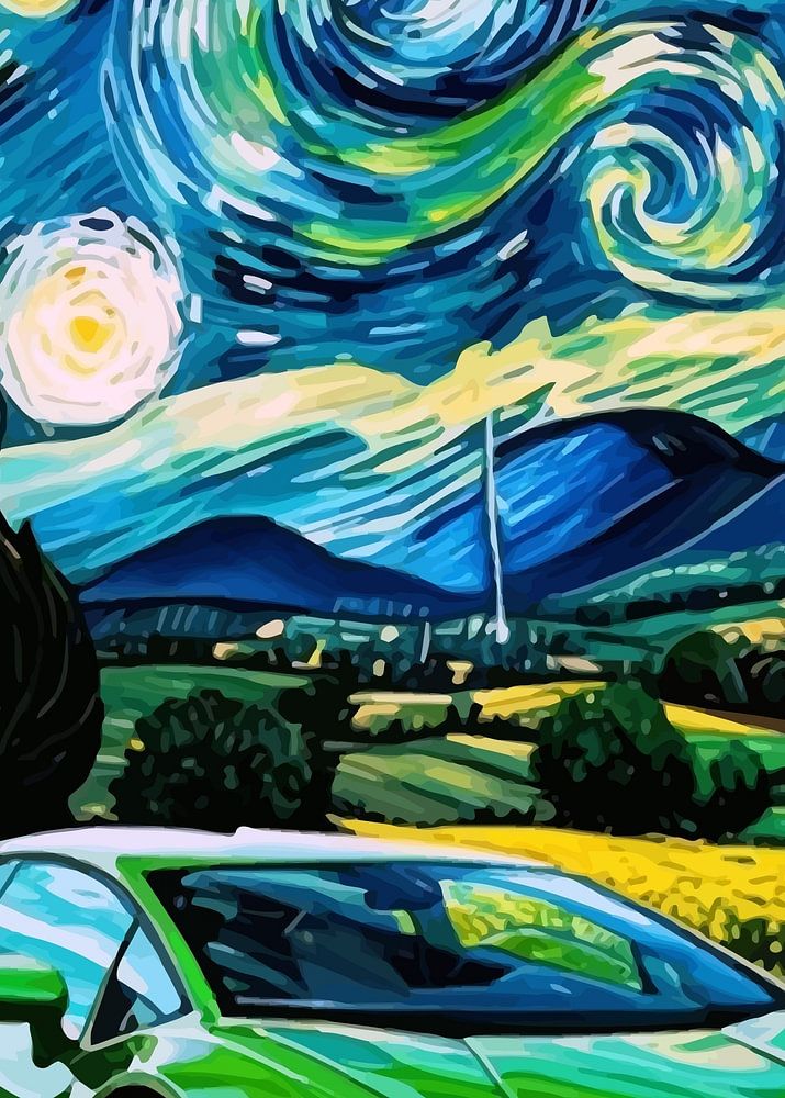 Sous le tourbillon céleste de la Nuit étoilée de Van Gogh, la Lamborghini Huracán s'accroupit avec agressivité. Les bleus et les ors tourbillonnants au-dessus de la tête ondulent sur sa forme aérodynamique, transformant la vitesse en art. On a l'impression que le ciel a été peint à l'image de la voiture - vivante, puissante et toujours en mouvement, faisant écho au pinceau et au moteur.
