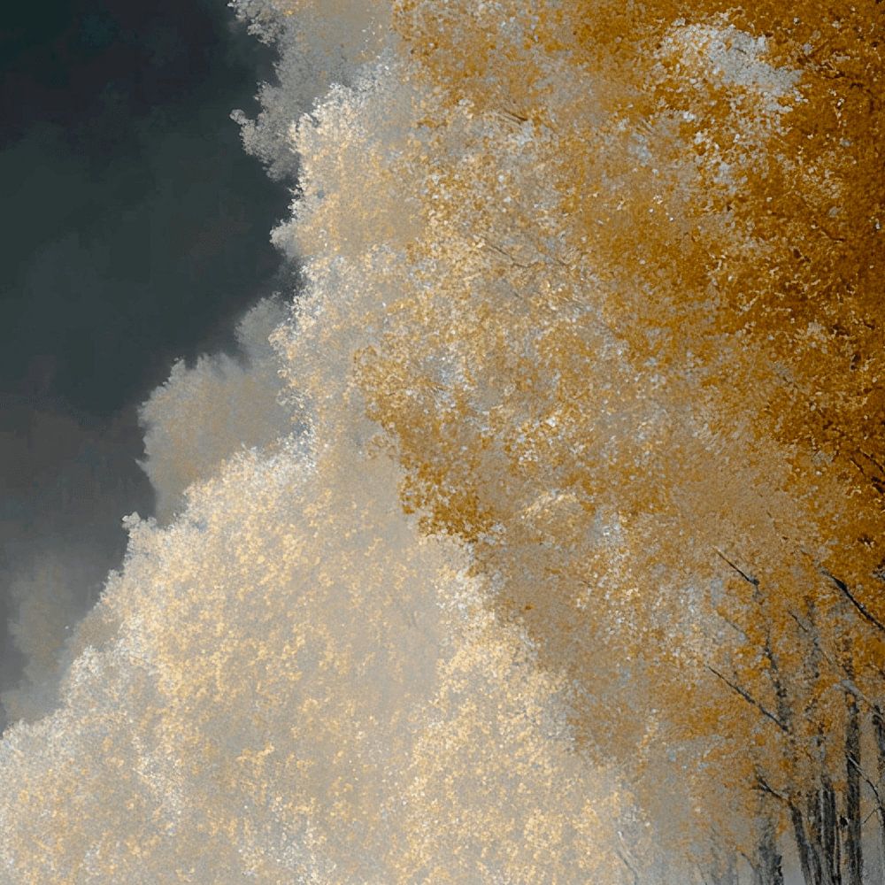 Cette œuvre d'art incroyablement puissante, Où l'automne et l'hiver s'embrassent d'un seul souffle, montre une séparation parfaite : des arbres d'hiver blancs et dénudés dans un brouillard froid à gauche, une explosion de feuilles d'automne chaudes et orangées à droite - avec une petite figure juste à la frontière. Parfait pour ceux qui recherchent des "impressions contrastées automne-hiver", des "allées d'arbres surréalistes" ou des "décorations murales symboliques des deux saisons".
