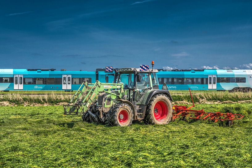 La ligne de chemin de fer de Leeuwarden traverse directement les terres agricoles près du village de Boksum, où, au moment de la photo, l'herbe du printemps est en train d'être retournée.