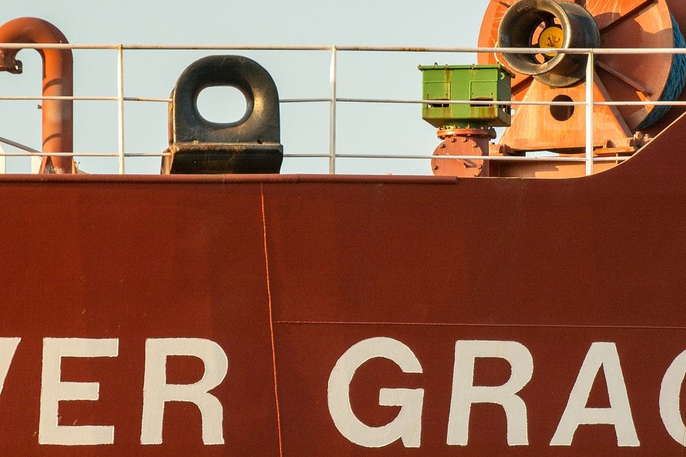 La proue de l'Ever Grace est un petit détail d'un vraquier. Les grands treuils d'ancre sautent à l'avant du navire et son nom est fièrement inscrit sur la proue. Un tout petit détail dans l'immense port.