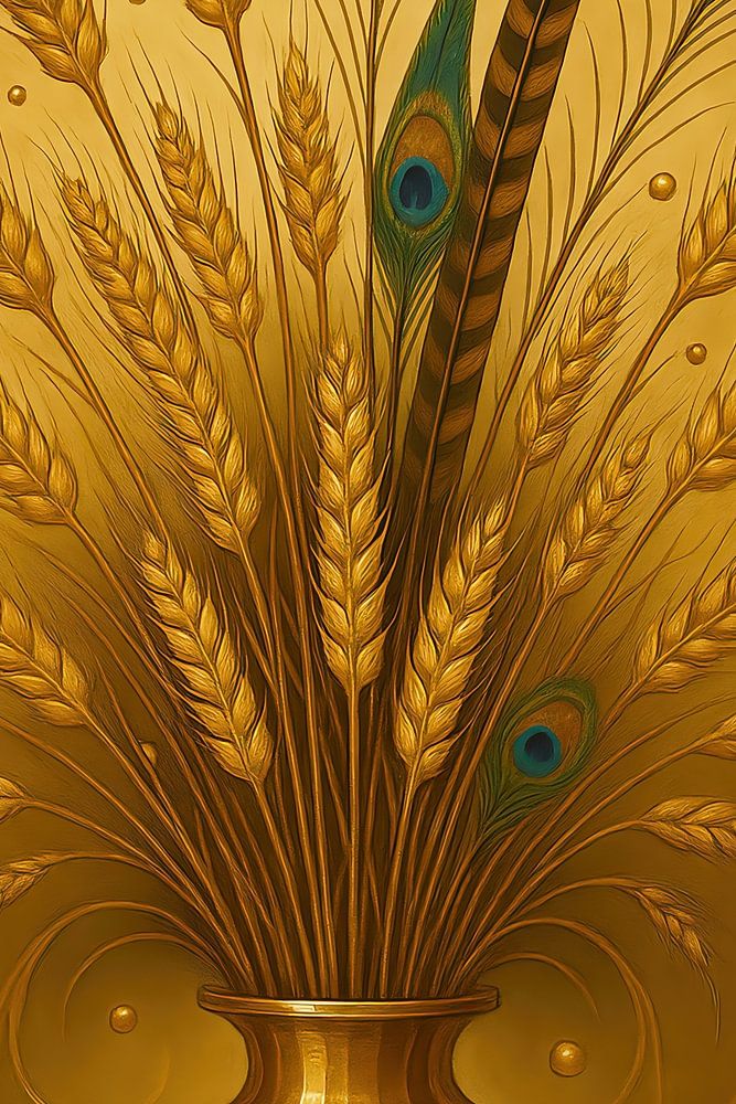 L'œuvre est dominée par une palette de couleurs riches et chaudes d'or, d'ambre et d'ocre, créant une atmosphère sereine et luxueuse. L'éclairage doux et chaud fait briller le blé et le vase, tandis que les "yeux" bleu-vert distinctifs des plumes de paon ajoutent un accent de couleur frappant et vibrant. La composition est équilibrée et dégage un sentiment d'abondance et de beauté naturelle.