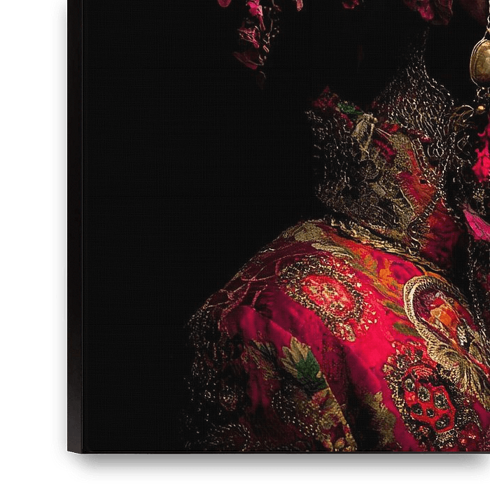 Parfait pour ceux qui recherchent un "portrait de femme avec couronne de fleurs", un "art de reine des fleurs à la peau foncée" ou une "décoration murale luxueuse avec portrait de fleurs". Le fond noir profond permet à sa beauté et aux fleurs de briller encore plus intensément. Idéal au-dessus d'un canapé, d'un buffet, d'un lit ou dans un couloir. C'est le pouvoir féminin à l'état pur et la splendeur naturelle sur votre mur.