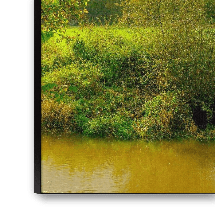 La rivière Dinkel à Twente serpente dans un paysage d'automne avec des feuilles colorées sur les arbres et des nuages dans le ciel en arrière-plan. La Dinkel prend sa source en Rhénanie-du-Nord-Westphalie, en Allemagne, et coule vers le nord jusqu'à Gronau, traverse la frontière avec les Pays-Bas (Overijssel), passe par Losser, Denekamp, et retraverse la frontière avec l'Allemagne (Basse-Saxe) pour rejoindre la Vechte à Neuenhaus, en Allemagne.