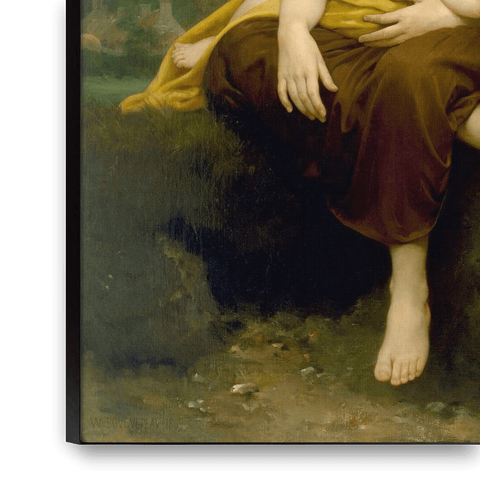 La jeune fille, qui regarde attentivement celui qui la regarde tout en tenant tendrement un bébé sur ses genoux, est dotée d'une beauté presque inexplicablement séduisante. William Bouguereau était la quintessence du peintre académique à succès. Ses toiles étaient très recherchées par les collectionneurs européens et américains, et sa renommée a été ravivée ces derniers temps.