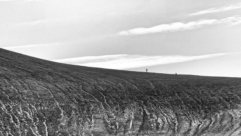 Dans cette représentation monochrome de l'arrière-pays islandais sauvage, près de Landmannalaugar, les forces impitoyables de la nature dominent le tableau. Un immense versant montagneux profondément érodé occupe toute la composition, avec ses textures complexes, presque extraterrestres, de pierre et de cendres, transformées par la lumière crue en un motif géométrique abstrait. La ligne diagonale marquée de la crête de la montagne traverse l'image de manière spectaculaire, se détachant sur un ciel clair et strié. Mais ce qui rend cette œuvre vraiment particulière et mérite qu'on s'y attarde, c'est le minuscule détail à l'horizon : à la limite extrême, là où la montagne et le ciel se rejoignent, se trouve une minuscule silhouette humaine. Sa présence fragile souligne l'échelle immense et écrasante de ce paysage primitif.