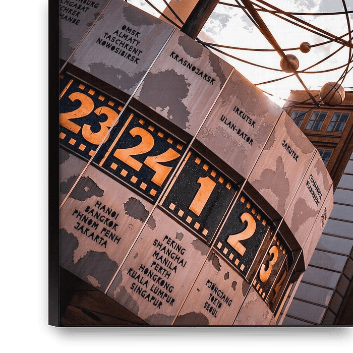 L'œuvre d'art "Berlin Fernsehturm und Weltzeituhr" montre deux emblèmes emblématiques de Berlin dans une composition urbaine claire : au premier plan, l'horloge universelle sur l'Alexanderplatz, à l'arrière-plan, la tour de télévision avec sa sphère caractéristique et la pointe de son antenne. L'horloge universelle, avec ses éléments rotatifs et ses noms de villes internationales, représente symboliquement l'interconnexion mondiale et la perception du temps. La tour de télévision se dresse au-dessus, signe technique et architectural de la ville.