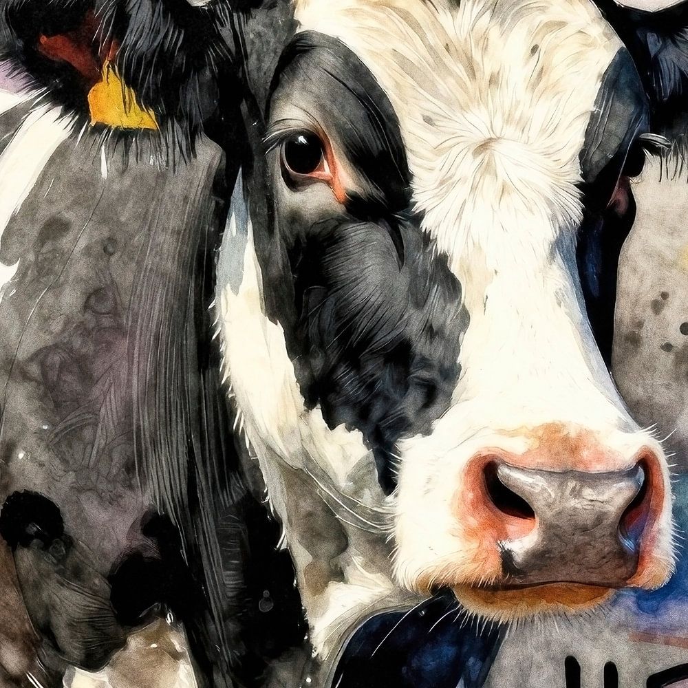 Une vache est représentée sur un fond orné d'éléments de graffiti colorés. La fusion entre réalisme et art urbain crée une scène saisissante.