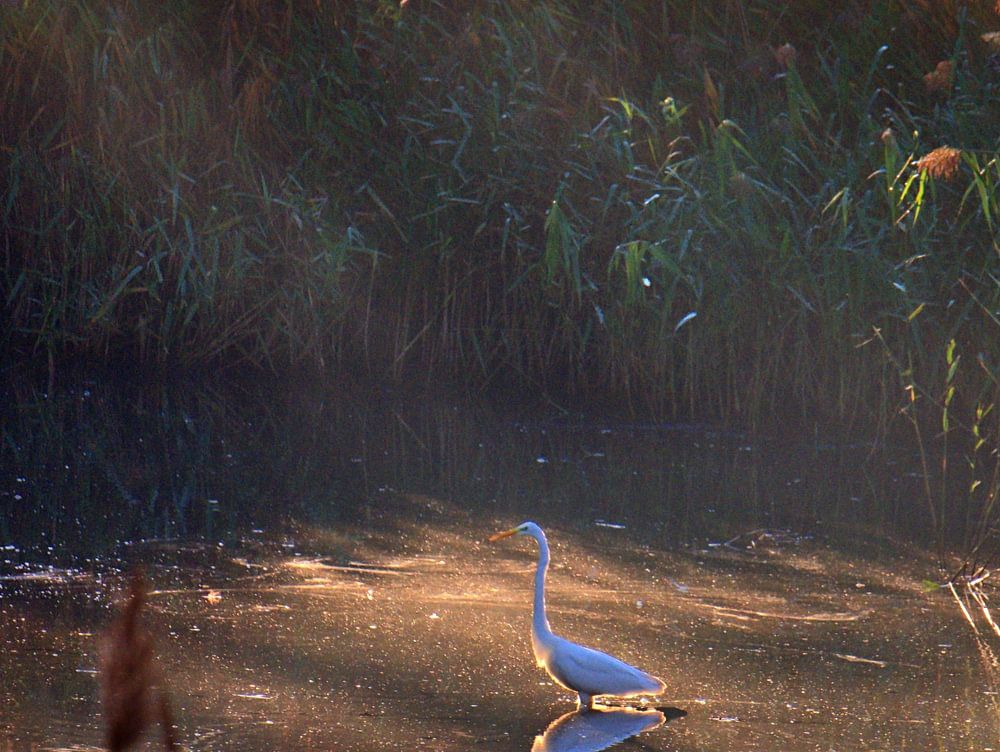 Aigrette garzette dans un étang tôt le matin en automne, peu après le lever du soleil à Gelsenkirchen-Erle.