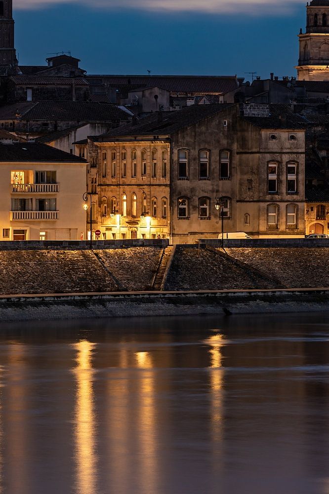 La nuit, tout change. L'ancienne ville d'Arles (France), située sur les rives du Rhône, se reflète dans le fleuve. La lumière dorée se reflète comme de longues et douces traînées dans l'eau et contraste merveilleusement avec le bleu et le rose du ciel.
