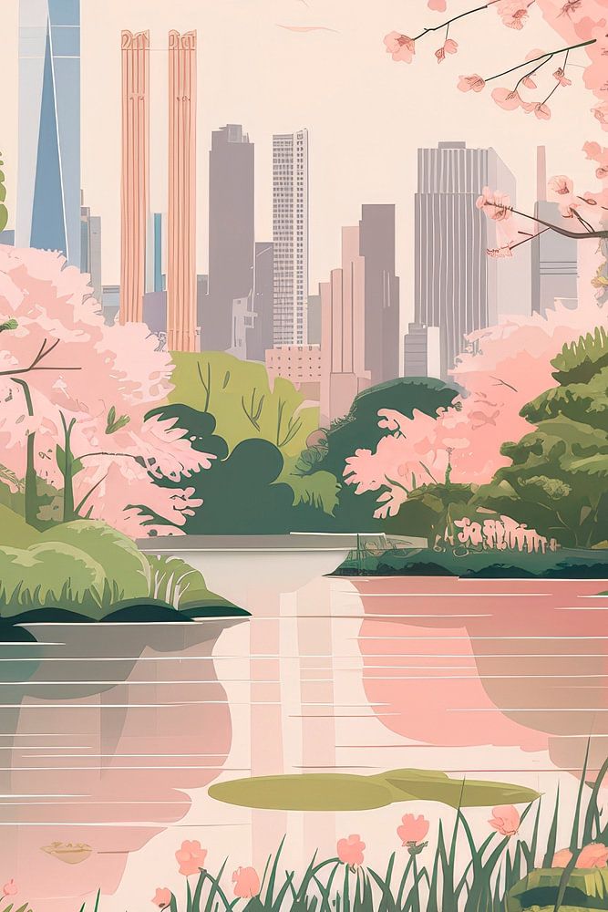 Une fusion harmonieuse entre l'élégance urbaine et la beauté naturelle : de douces fleurs de cerisier encadrent un étang scintillant, tandis que la ligne d'horizon de New York trône en arrière-plan. Cette représentation inspirante apporte un sentiment de liberté et de détente dans chaque pièce. Parfait pour le salon ou le bureau à domicile afin de stimuler la pensée créative.