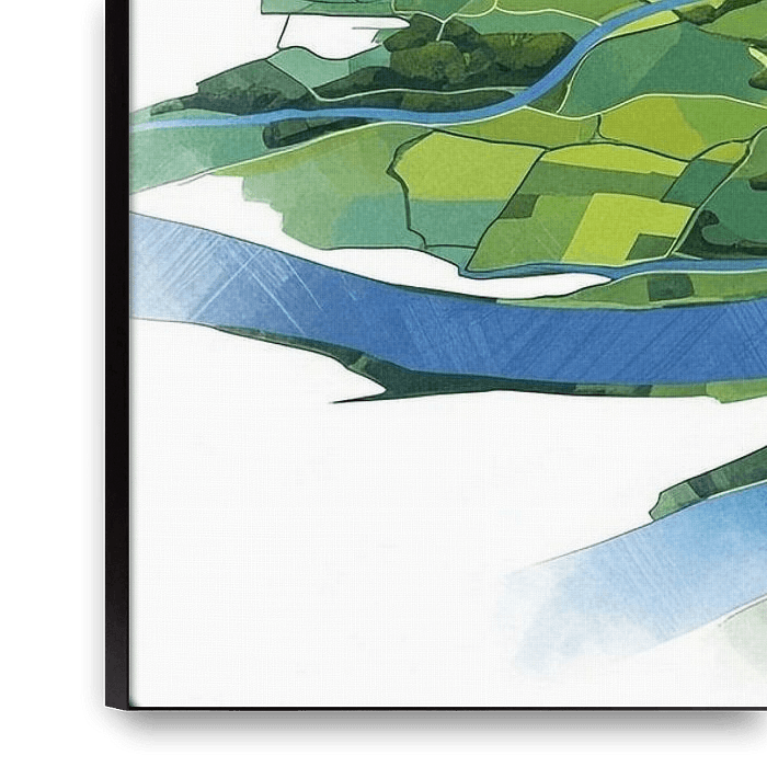 Illustration numérique magnifiquement détaillée d'une ville tentaculaire entourée de rivières et de champs verdoyants, vue du ciel. L'œuvre capture l'harmonie entre le design urbain et la nature, avec des voies d'eau bleues sinueuses reliant les quartiers animés de la ville et la campagne sereine. Parfait pour les amateurs d'art…