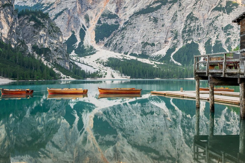 Le célèbre Lago di Braies ou Pragser Wildsee avec ses eaux vertes, un hangar à bateaux et des barques dans les eaux calmes avec le reflet des Dolomites environnantes, un matin d'été en Italie.