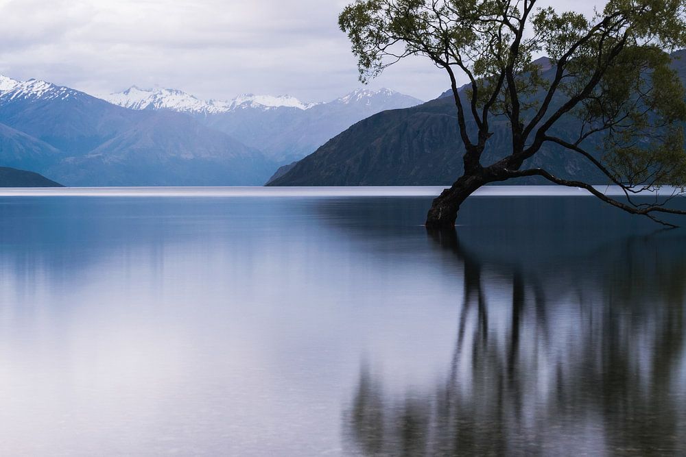 Le lac Wanaka en Nouvelle-Zélande au coucher du soleil. Un beau lac de montagne avec un reflet dans l'eau. Sur la photo, vous voyez #thatwanakatree, un endroit bien connu en Nouvelle-Zélande.