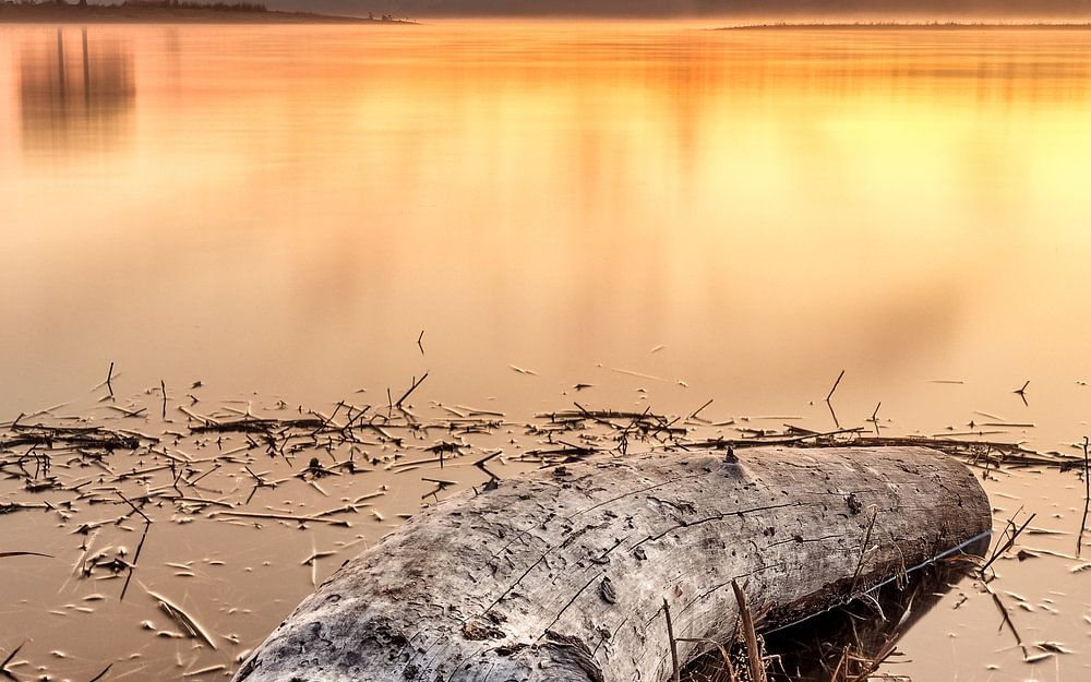 Lac avec un tronc d'arbre échoué dans la lumière du soleil du soir