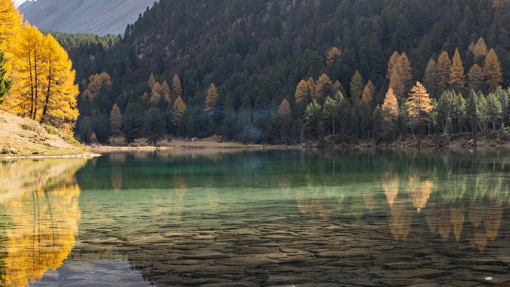 J'ai déjà publié une photo de ce magnifique lac des Alpes suisses. Mais cette photo a été prise de l'autre côté, ce qui donne une image complètement différente. Sur cette photo, vous pouvez à nouveau voir le calme serein et les magnifiques mélèzes de couleur jaune qui sont si caractéristiques de l'automne dans ces régions. À l'aide d'un filtre polarisant, j'ai pu créer une image où l'on peut clairement voir les pierres sous la surface, tout en ayant de beaux reflets des arbres et des montagnes en arrière-plan. Les pierres au premier plan contribuent à suggérer une grande profondeur dans l'image. Au loin, de l'autre côté à gauche, vous pouvez voir deux autres personnes assises sur un banc. On peut les imaginer en train de profiter de la vue pendant un moment.