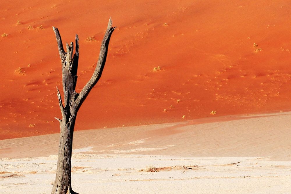 Acacia (Camelthorn) mort et pétrifié dans les salines parmi les dunes de sable orange dans un paysage naturel surréaliste et stérile. Dodevlei (Dead Vlei), Deadvlei, Sossusvlei, Namibie.