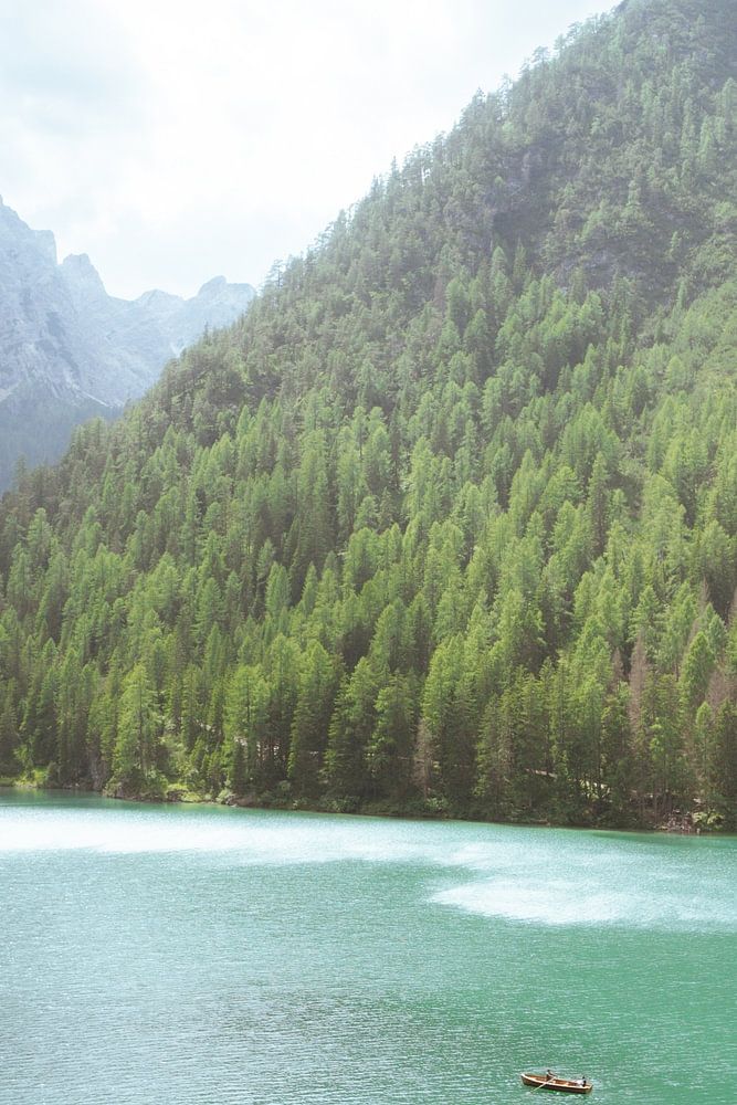 Photo mélancolique au Lago di Baries (Pragser Wildsee) dans les Dolomites, avec les montagnes et les canoës en arrière-plan. Cette image a été créée au cours d'une randonnée, lors d'une étape du voyage en Italie.