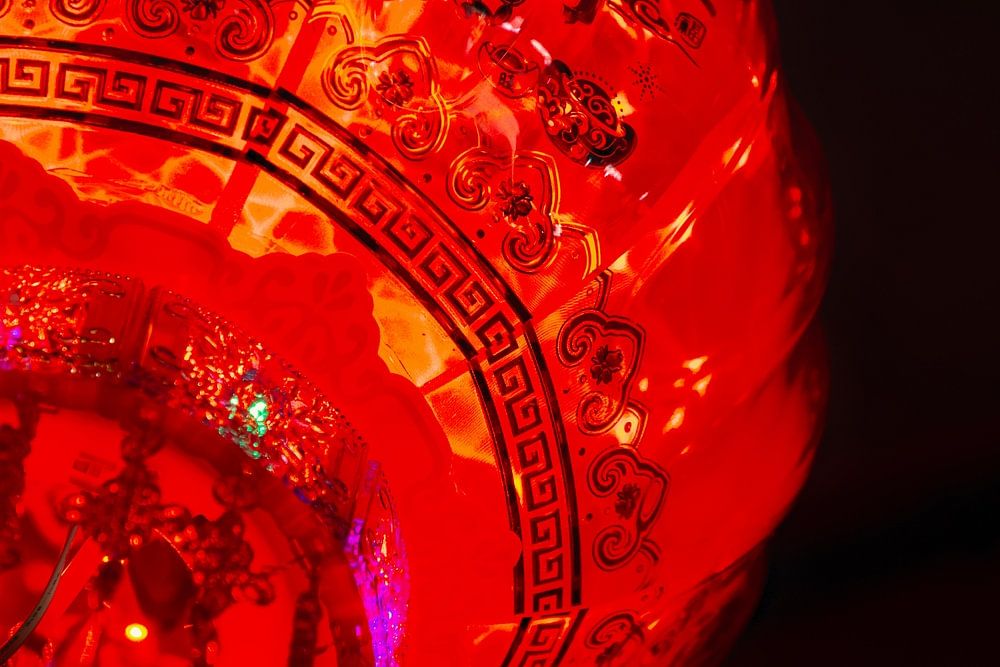 Gros plan sur une lanterne chinoise rouge à Kuala Lumpur, en Malaisie, photographiée sur fond noir.