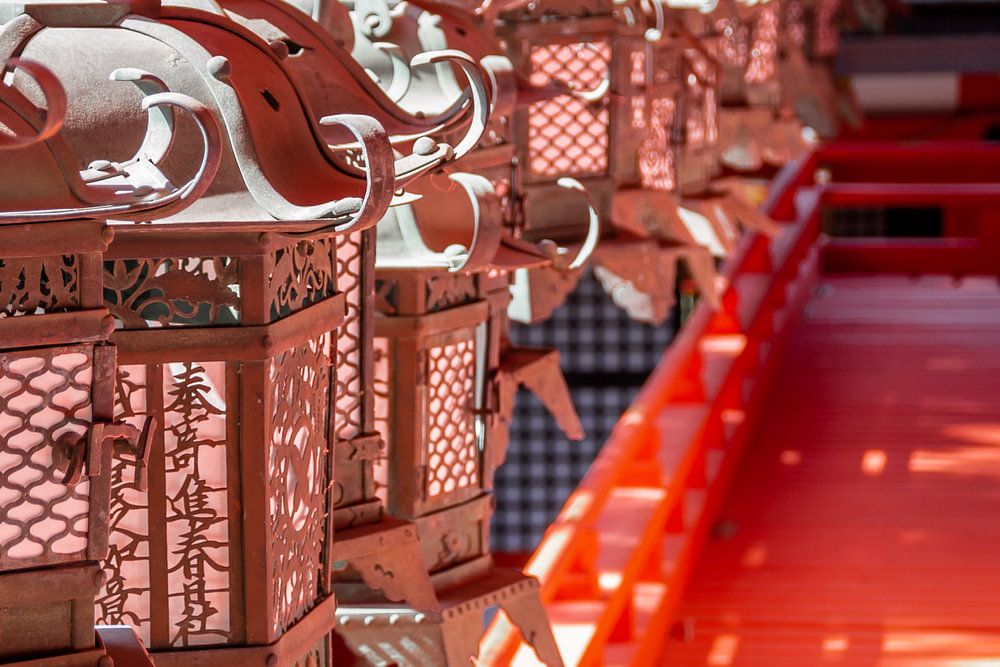 Lanternes suspendues près d'un temple japonais dans la ville de Nara, près de Kyoto et d'Osaka. Temple peint en orange et lanternes en métal.
