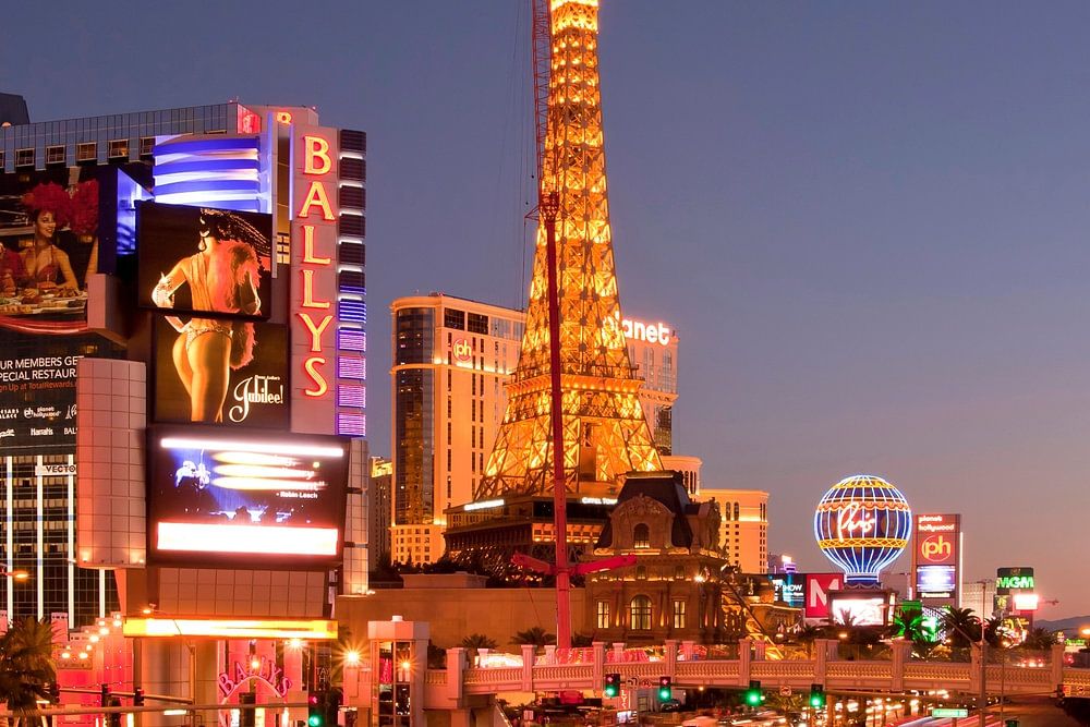 Circulation sur le boulevard ou le Strip de Las Vegas avec les hôtels Ballys et Paris la nuit, Las Vegas, Nevada, États-Unis d'Amérique, USA | Circulation sur le boulevard ou le Strip de Las Vegas avec les hôtels Ballys et Paris, Las Vegas, Nevada, États-Unis d'Amérique, USA