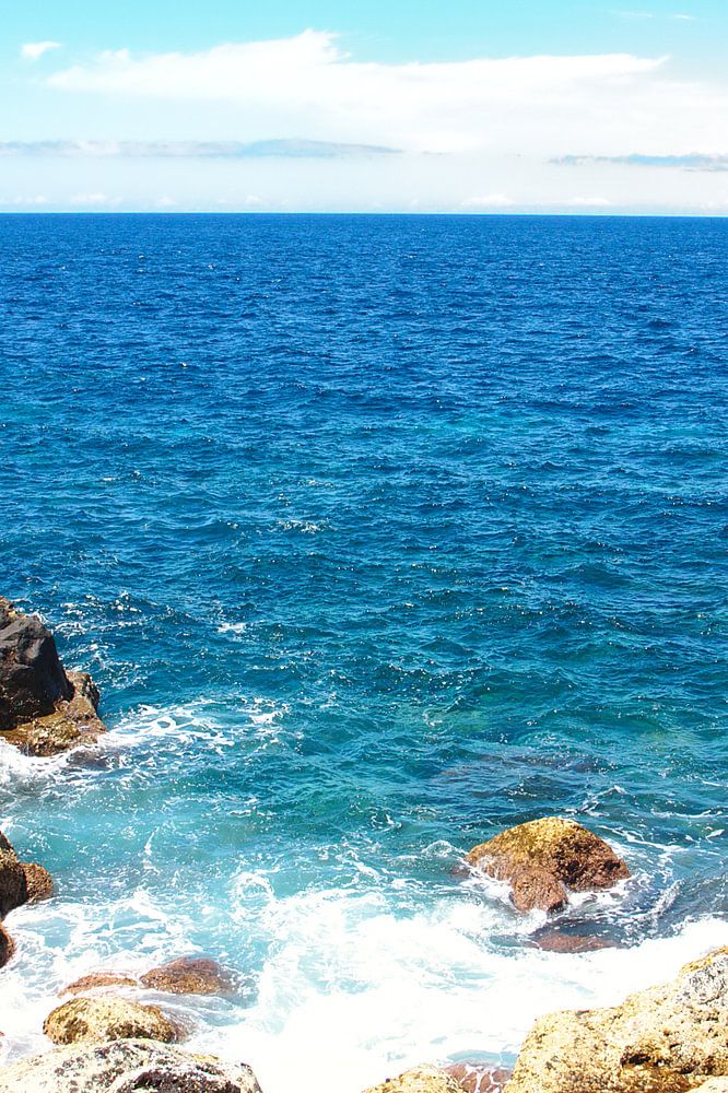 Lavarotsen in de oceaan op de Azoren. Een enorme hoeveelheid van lavasteen is in de Atlantische Oceaan geduwd na een vulkaanuitbarsting. Heerlijke blauwe zee en hemel.