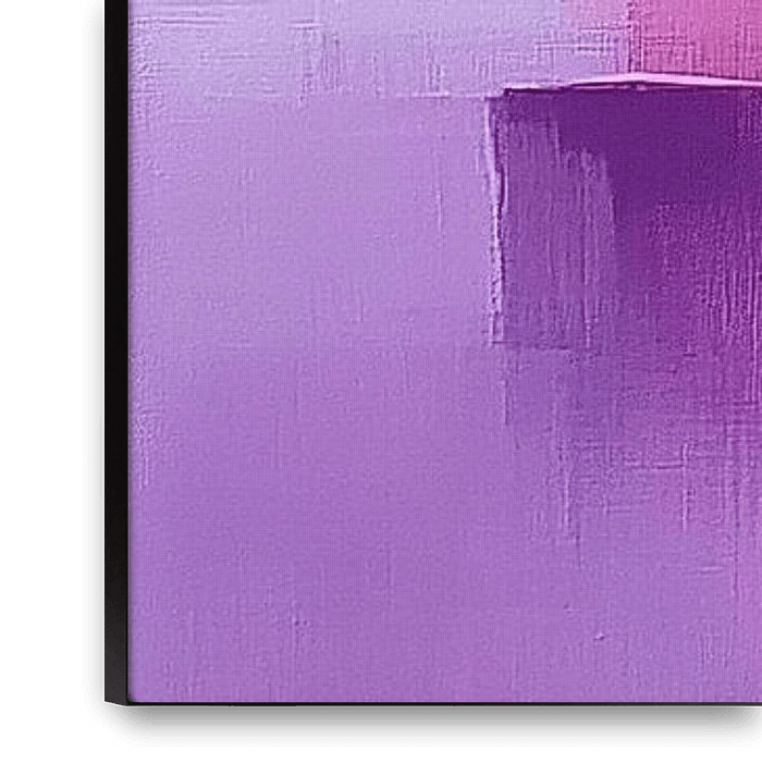 Lavender City Glow - Cette peinture abstraite représente de grands carrés jaunes tels des taches de lumière flottant entre des blocs aux teintes douces de violet et de rose, formant ensemble une ligne d'horizon moderne et onirique. Il s'agit d'une peinture abstraite joyeuse, riche en couleurs et en textures.