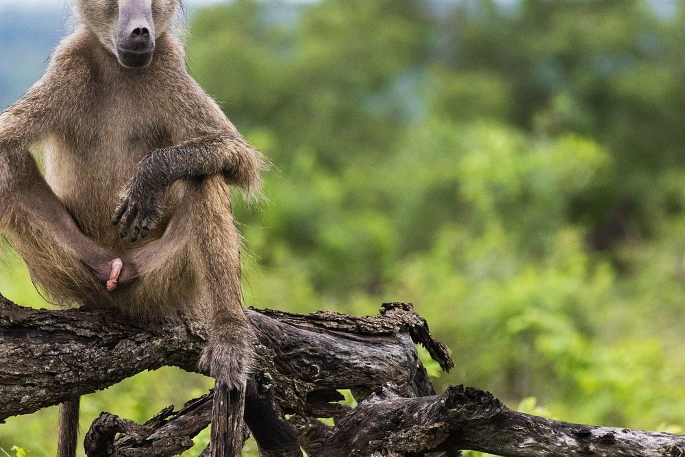 Comme s'il était assis sur son trône, ce babouin regarde le monde d'un œil confiant. Il a tout vu, tout vécu, et plus rien ne peut l'étonner. La jungle est son royaume et, de cette haute branche, il règne sur le royaume vert qui l'entoure. Sa posture respire la nonchalance, comme s'il pouvait à tout moment partager un sort sage ou simplement profiter de la tranquillité de la nature.