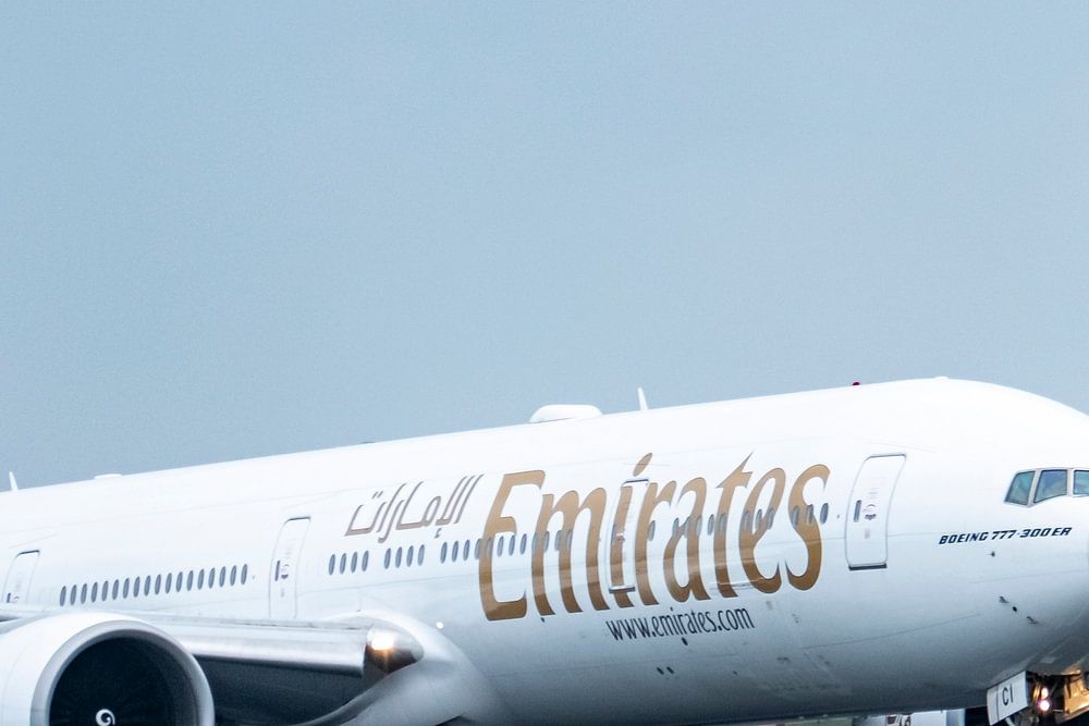 Le Boeing 777-300ER de la compagnie Emirates Airline atterrit à l'aéroport de Schiphol sur le Polderbaan par un temps couvert à l'aéroport d'Amsterdam Schiphol aux Pays-Bas.