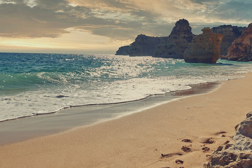Coucher de soleil sur Praia Marinha, Algarve, Portugal. Empreintes sur la plage et coucher de soleil tons chauds.
