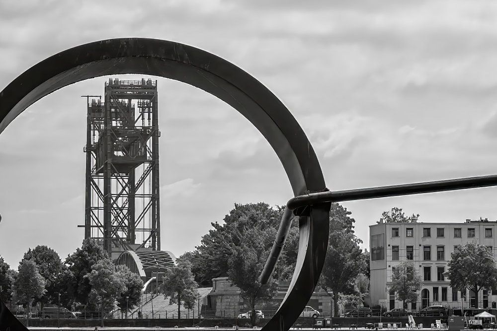 L'œuvre d'Auke de Vries, "la corde à linge", est suspendue au Boompjes, dans le centre de Rotterdam, à côté du pont Prince Willem-Alexander. Une belle entité au-dessus de l'eau, à côté du pont. Un régal pour les yeux. Grâce à l'un des éléments, j'ai pu photographier l'ancien pont ferroviaire "De Hef". Il se trouve de l'autre côté de la rue sur l'île du Nord. La photo a été post-traité dans une version noir et blanc contracté. Ma version préférée. Le bateau taxi qui passe à proximité complète l'image. Rotterdam : une ville magnifique.
