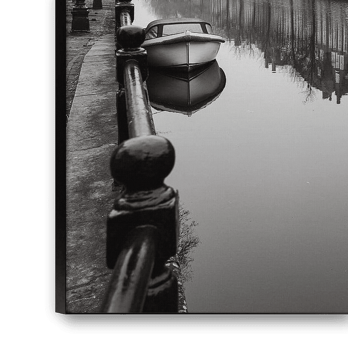 Il y a des matins qui semblent venir d’un autre temps. Celui-ci en faisait partie. Une brume grise et silencieuse flottait au-dessus du canal du Rapenburg à Leyde, adoucissant chaque contour et transformant l’eau en un miroir parfait. Les reflets des bâtiments anciens sont si nets qu’on distingue à peine où finit le canal et où commence la rue. Le bateau en bas à gauche ancre discrètement la scène, tandis que les arbres nus de chaque côté dessinent une structure fine et fragile. L’image semble suspendue — aucune présence, aucun vent, juste du silence. Le noir et blanc réduit tout à l’essentiel : la forme, la lumière, la structure. Ce calme va au-delà de l’image. C’est une sérénité qui ralentit les pensées et fait remarquer les petits détails, comme la courbe d’une rambarde ou l’alignement des fenêtres. Une tranquillité hors du temps, qui reste en mémoire.