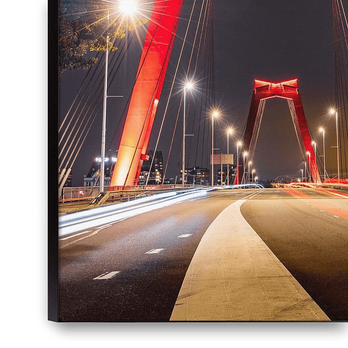 Vue du Willemsbrug à Rotterdam le soir. La longue vitesse d'obturation crée des rayures de lumière pour les voitures.
