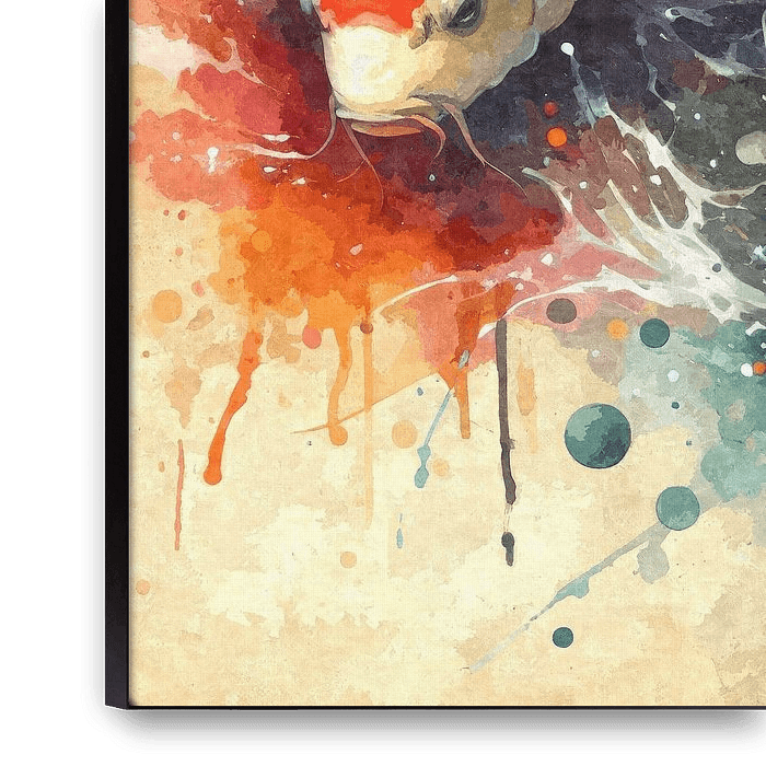 Deux poissons koi nagent dans un cercle dynamique, capturés dans des couleurs d'eau vives. L'un des koïs affiche de l'orange, du noir et du blanc, l'autre du rouge, du blanc et du bleu - un jeu visuel de contraste et d'équilibre. Les mouvements fluides des nageoires et le fond pétillant de taches de couleur rose, bleu et orange…