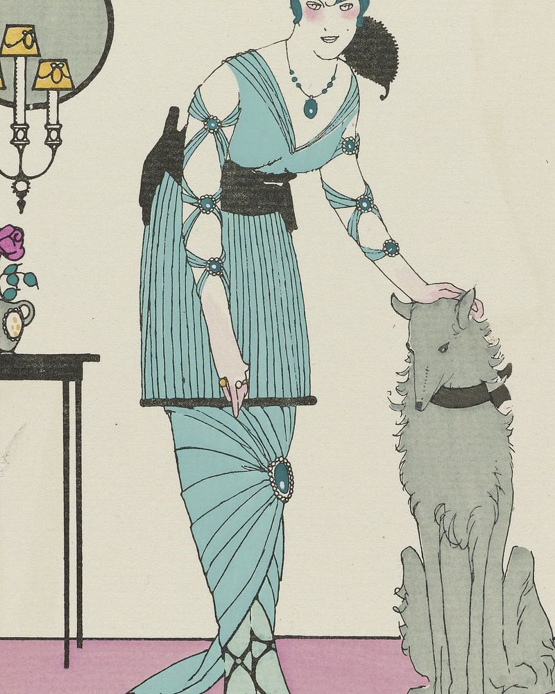 Un imprimé de mode historique avec une touche moderne : "Le bon chien". Inspiré par l'Art Déco, un mouvement de style qui a émergé dans les années 1920. Un nouveau style commercial mélangé à des lignes et des couleurs modernes et épurées.