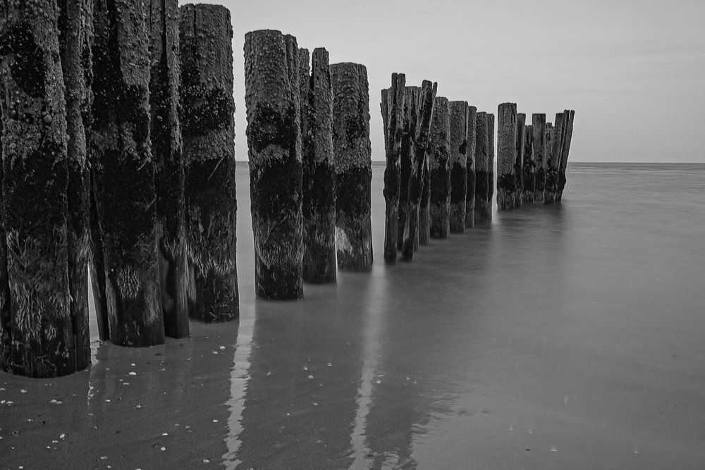 Ces brise-lames se trouvent au Kerf à Schoorl. L'utilisation d'un filtre gris vous permet d'utiliser une vitesse d'obturation lente, rendant l'eau soyeuse. Cela attire toute l'attention sur les bornes.