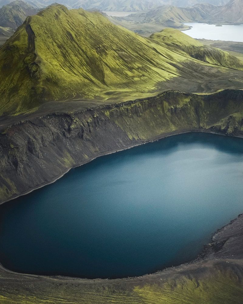 Cette photographie de Hnausapollur, en Islande, dégage une sérénité apaisante et dynamique qui apporte sans effort une atmosphère calme à tout espace. Le lac d'un bleu immaculé, entouré d'une verdure éclatante, offre une tranquillité qui est au cœur de la composition. La forme spectaculaire de la montagne voisine et les pics lointains enveloppés de brume évoquent des forces géologiques anciennes et une histoire terrestre mouvementée.