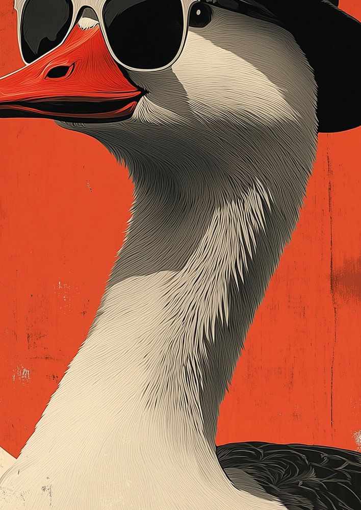 Cette image représente un canard prenant la pose d'un mannequin élégant portant des lunettes de soleil et un chapeau.