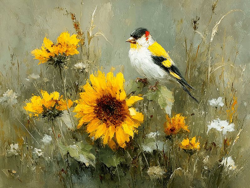 Atmosphère : estivale, joyeuse et pleine d'énergie insouciante. Émotion : joie pure, liberté et émerveillement tranquille. Utilisation des couleurs : jaune vif et or des tournesols, rouge-jaune-noir coloré du chardonneret, vert tendre et crème de la prairie - comme un jour d'été parfait en pleine floraison.