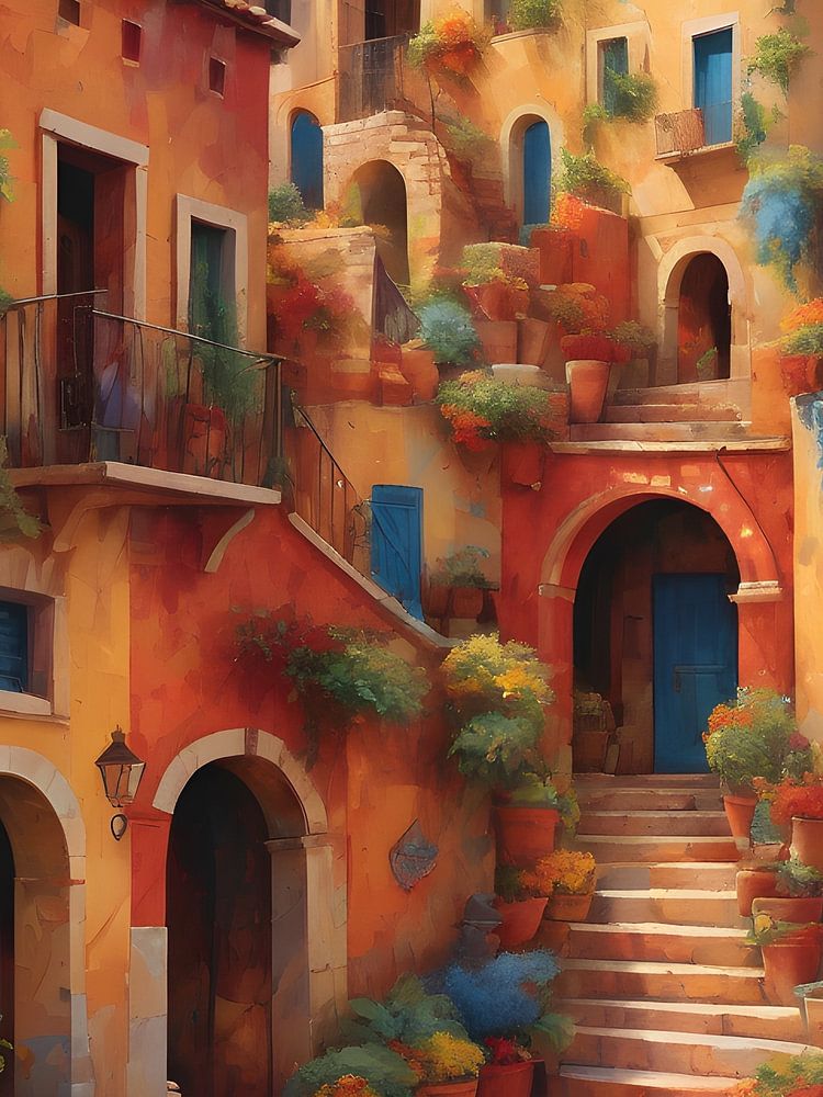 Cette œuvre d'art capture l'éclat et la chaleur d'une rue méditerranéenne par une journée d'été. Les façades colorées des maisons, allant de tons jaunes doux à des couleurs de terre cuite profondes, sont rehaussées par le bleu vif des portes et des fenêtres. Partout, des pots en terre cuite remplis de plantes et de fleurs luxuriantes ajoutent un charme rustique et une beauté naturelle à la scène.