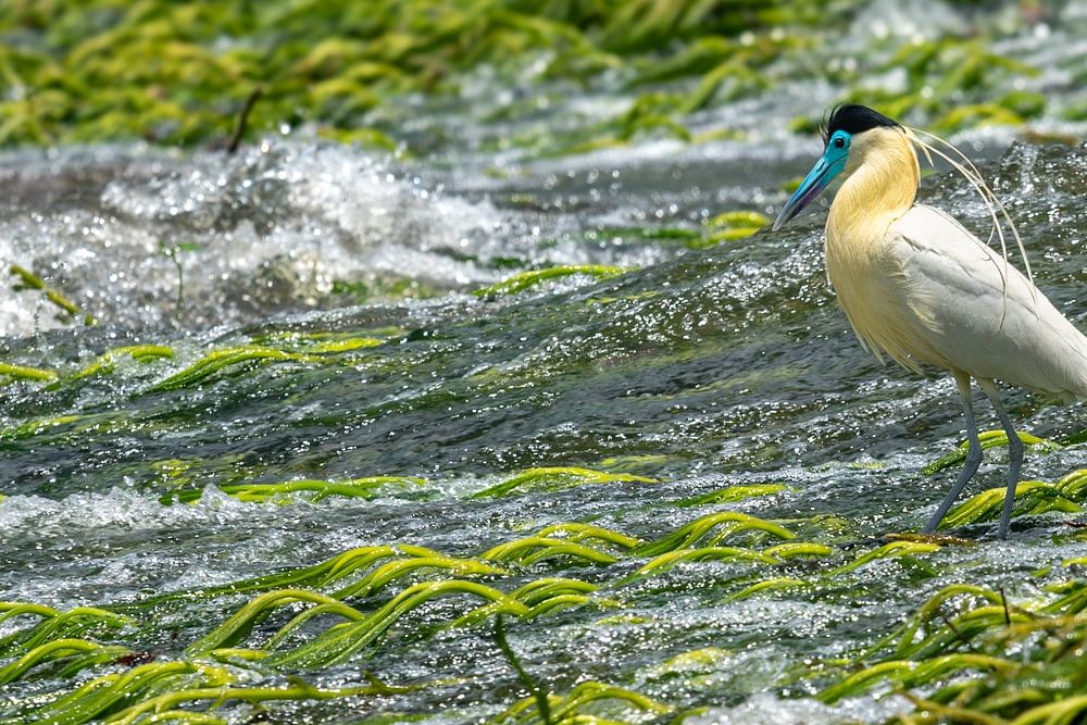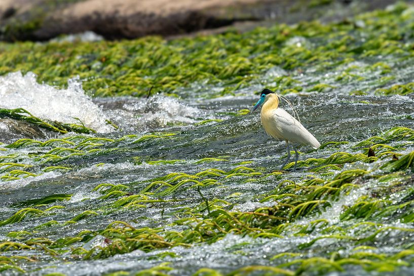 Un spectacle rare dans les sula's du Surinam. Au milieu des eaux rugissantes des rapides d'Awarradam, ce héron capucin veille imperturbablement. Avec son bec bleu distinctif et ses plumes d'un blanc immaculé, il offre un beau contraste avec les plantes aquatiques d'un vert éclatant qui tapissent les rochers. Ce cliché capture le…