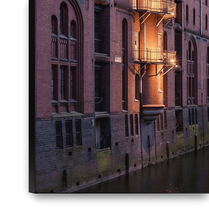 Le château entouré de douves et les entrepôts de la Speicherstadt dans le port de Hambourg la nuit.