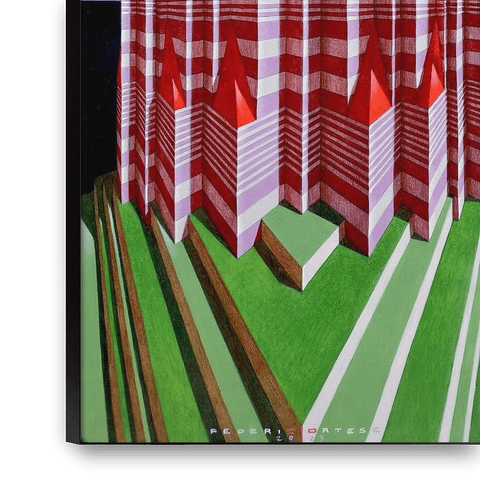 J'aime créer des mondes imaginaires. J'invente des réalités virtuelles simplifiées, probablement le résultat de souvenirs de voyage et d'expériences passées. Je choisis les types de bâtiments, je les place sur un terrain fictif, je vérifie les couleurs des différentes parties, les lumières, les éléments du paysage. Ensuite, je choisis un point de vue et je dépeins ce lieu de fantaisie. La peinture de paysage traditionnelle doit composer avec les variables atmosphériques, avec la mutabilité de la lumière naturelle. Ici, au contraire, non seulement tout est statique, mais je peux changer les différents éléments à volonté : ajouter ou enlever des pièces, déplacer quelque chose, essayer les effets d'ombres en fonction du mouvement des lumières. Mais c'est une petite différence, et la différence entre la réalité réelle et la réalité virtuelle est également petite : elle fait désormais partie de notre vie quotidienne, a changé notre façon de percevoir, et est en quelque sorte devenue elle-même réelle.